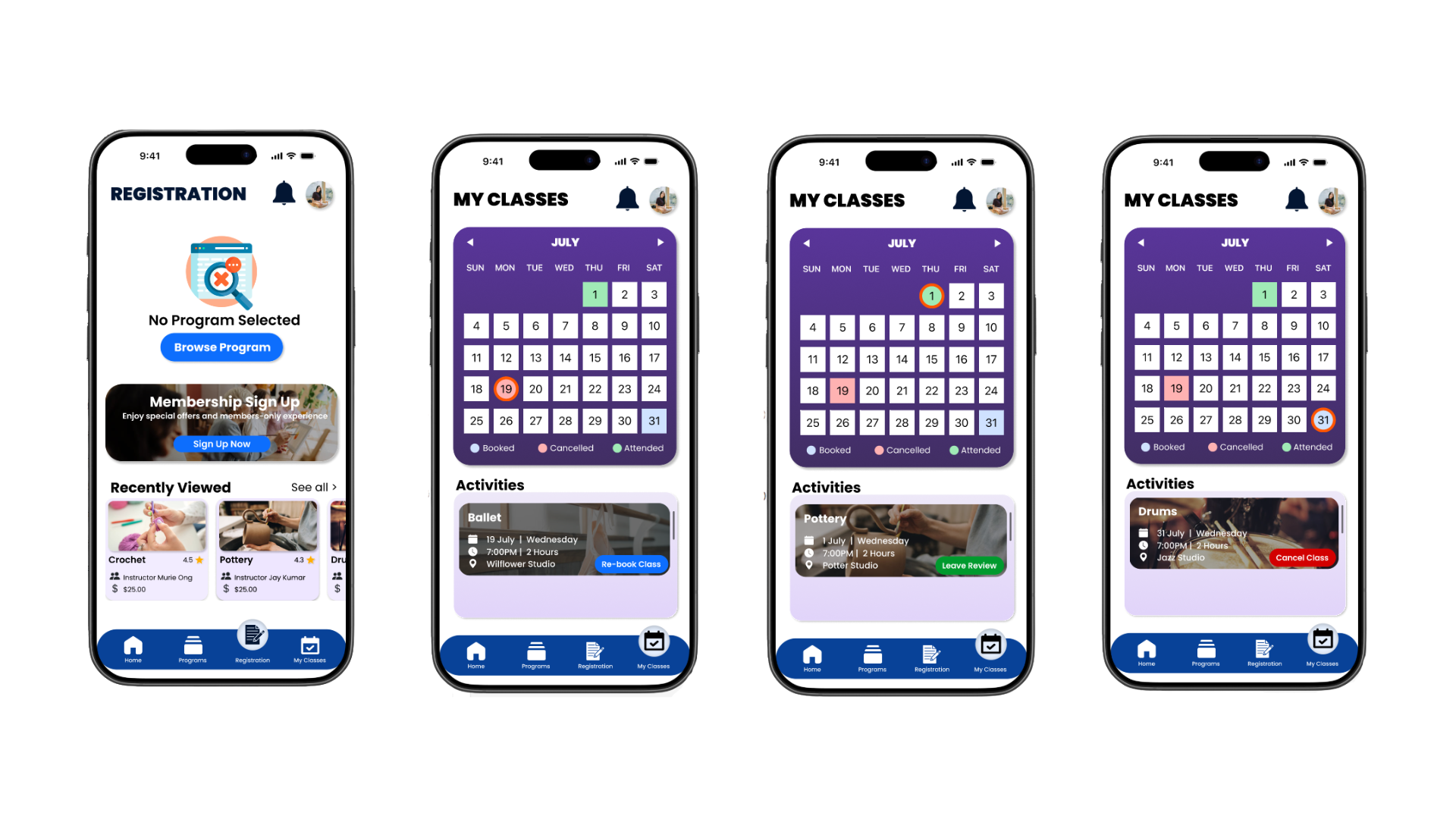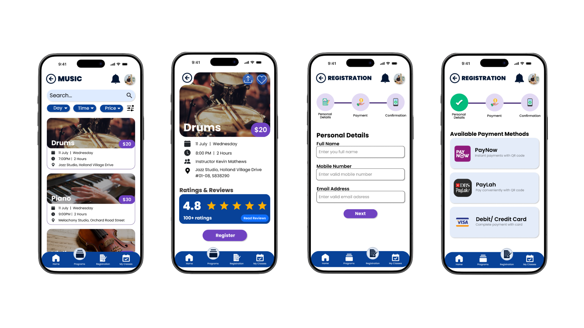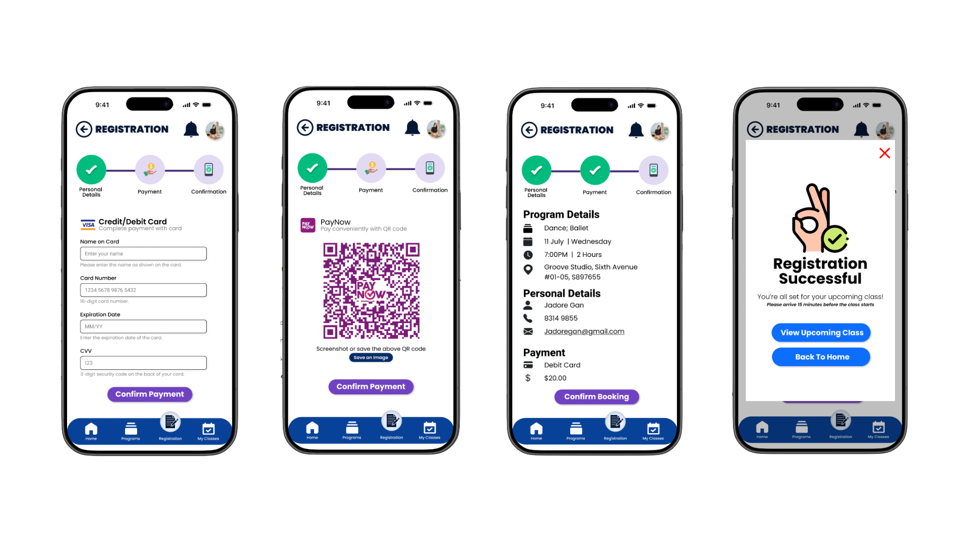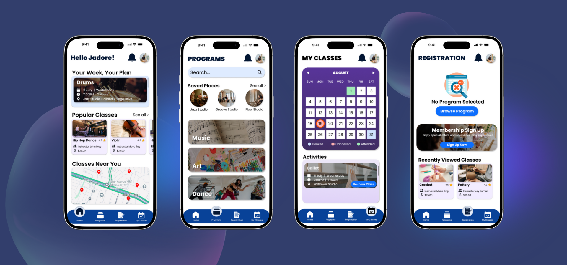 The app consists of 4 main pages: Home, Programs, Registration and My Classes, each created to streamline the user experience and make information and enrolment easy to access.