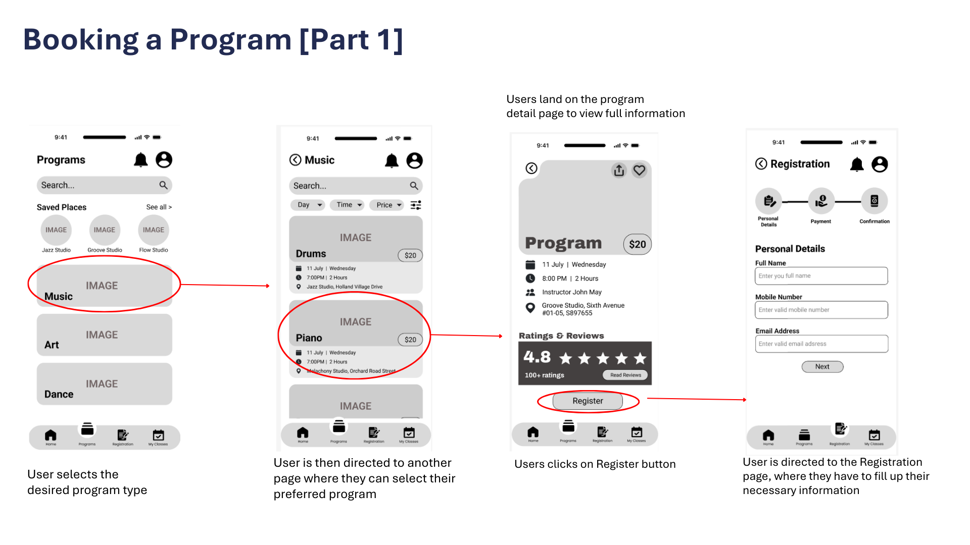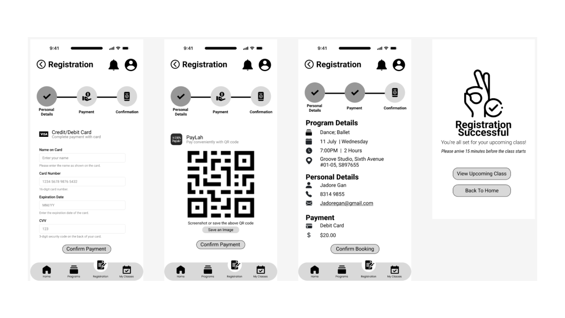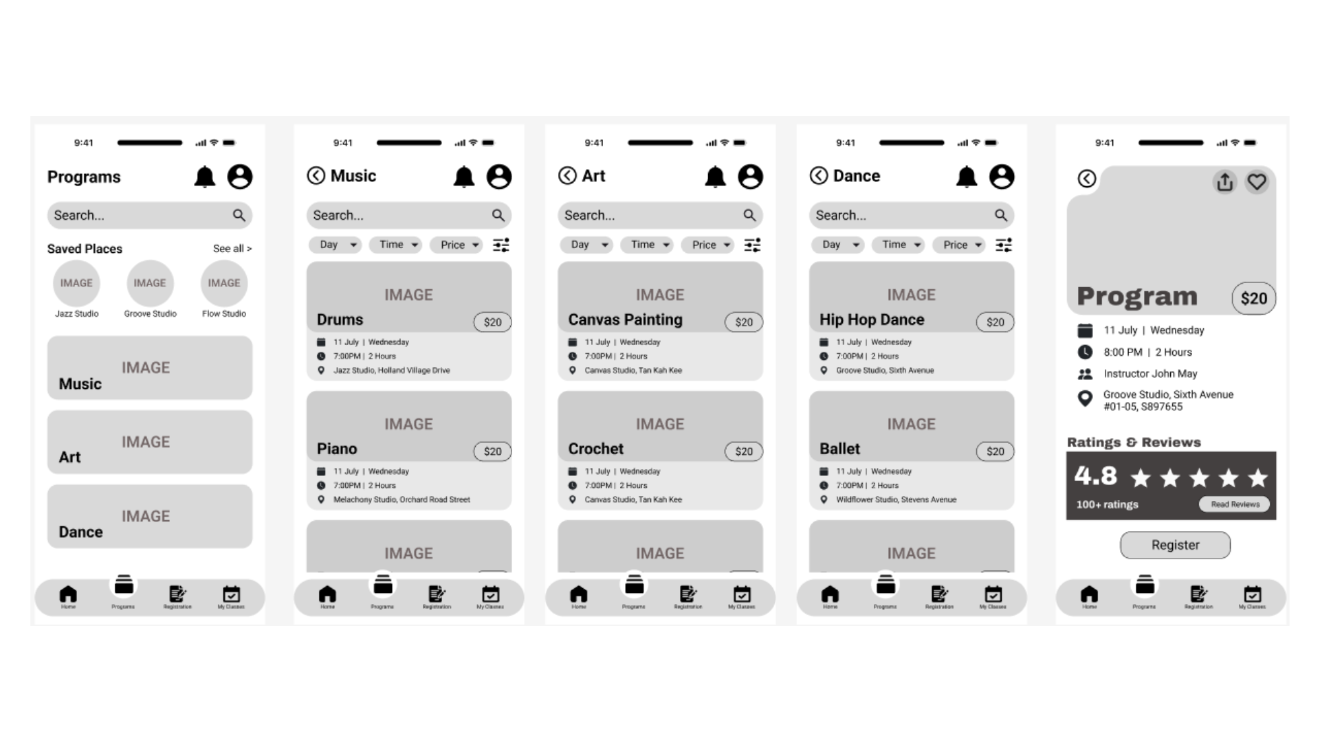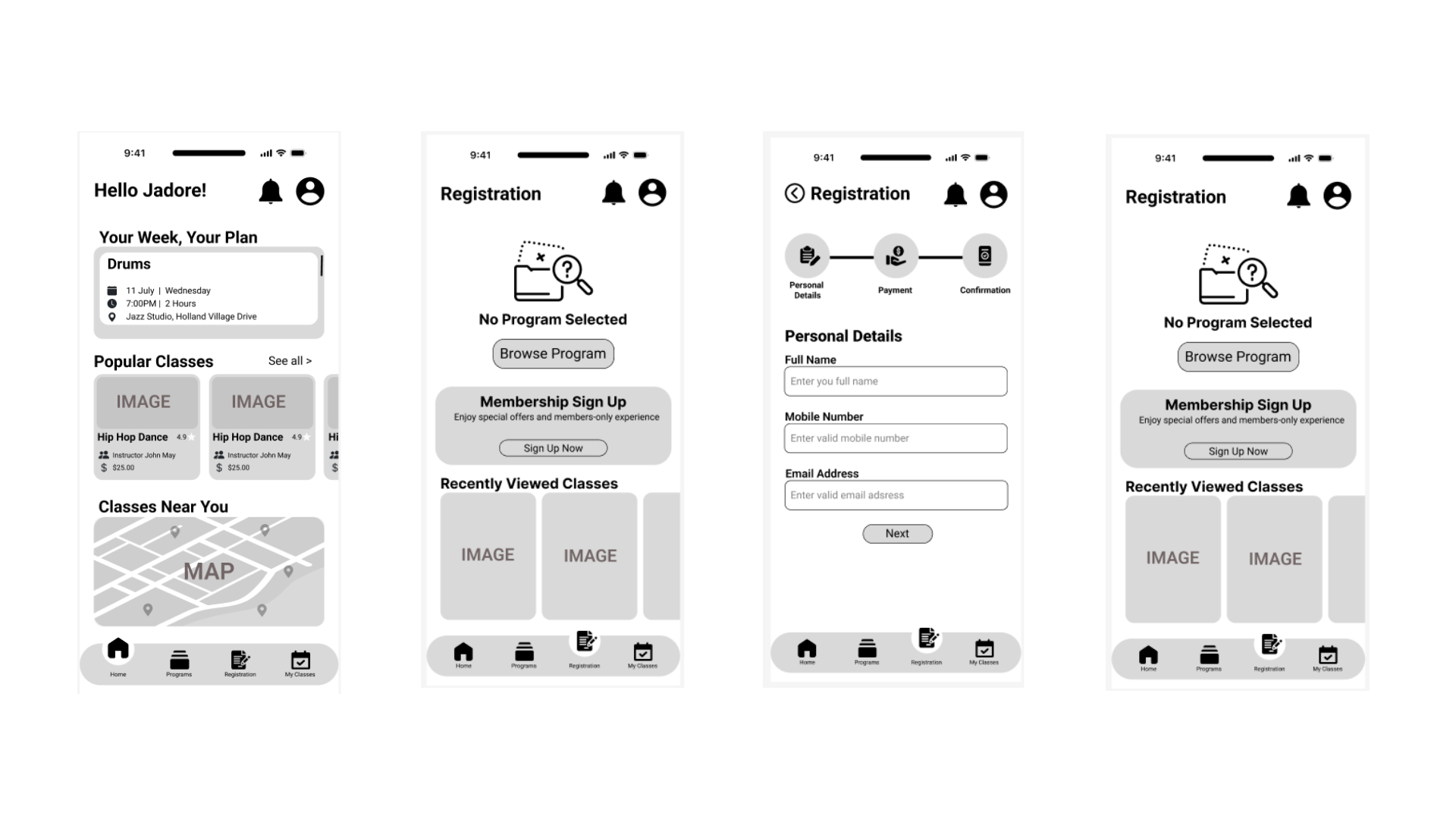 The app consists of 4 main pages: Home, Programs, Registration and My Classes, each created to streamline the user experience and make information and enrolment easy to access.