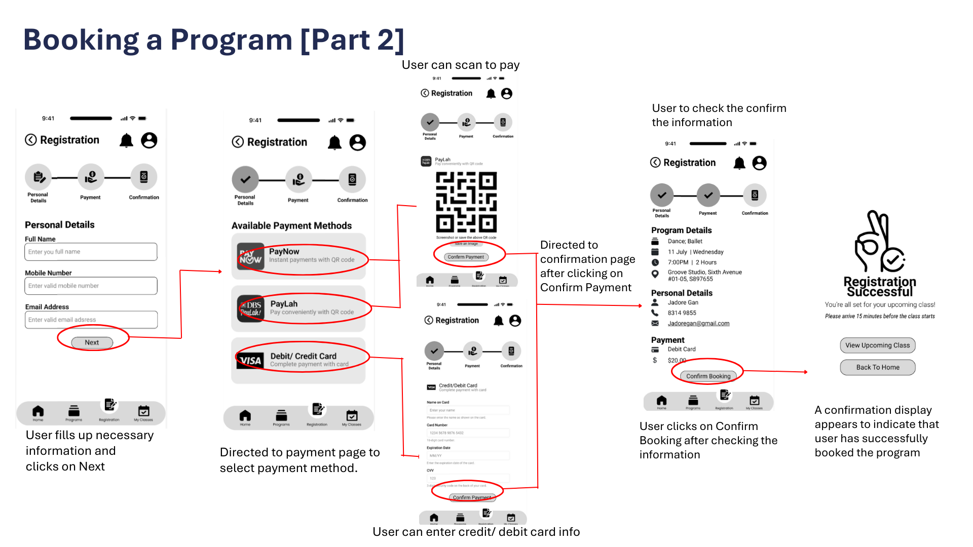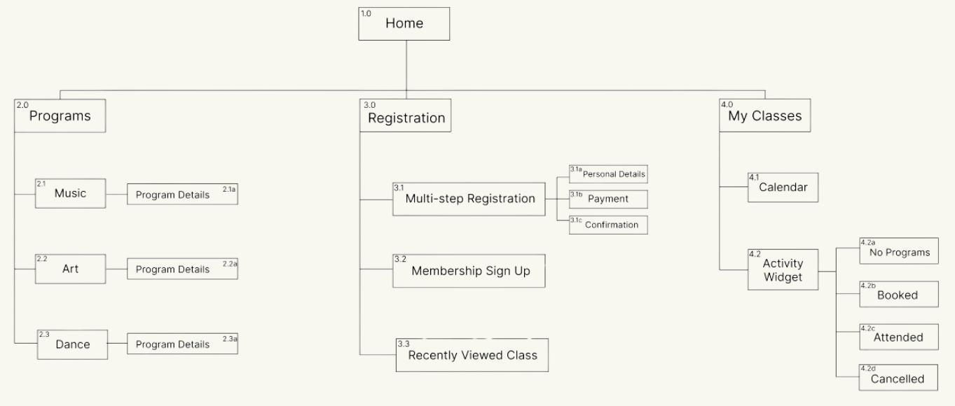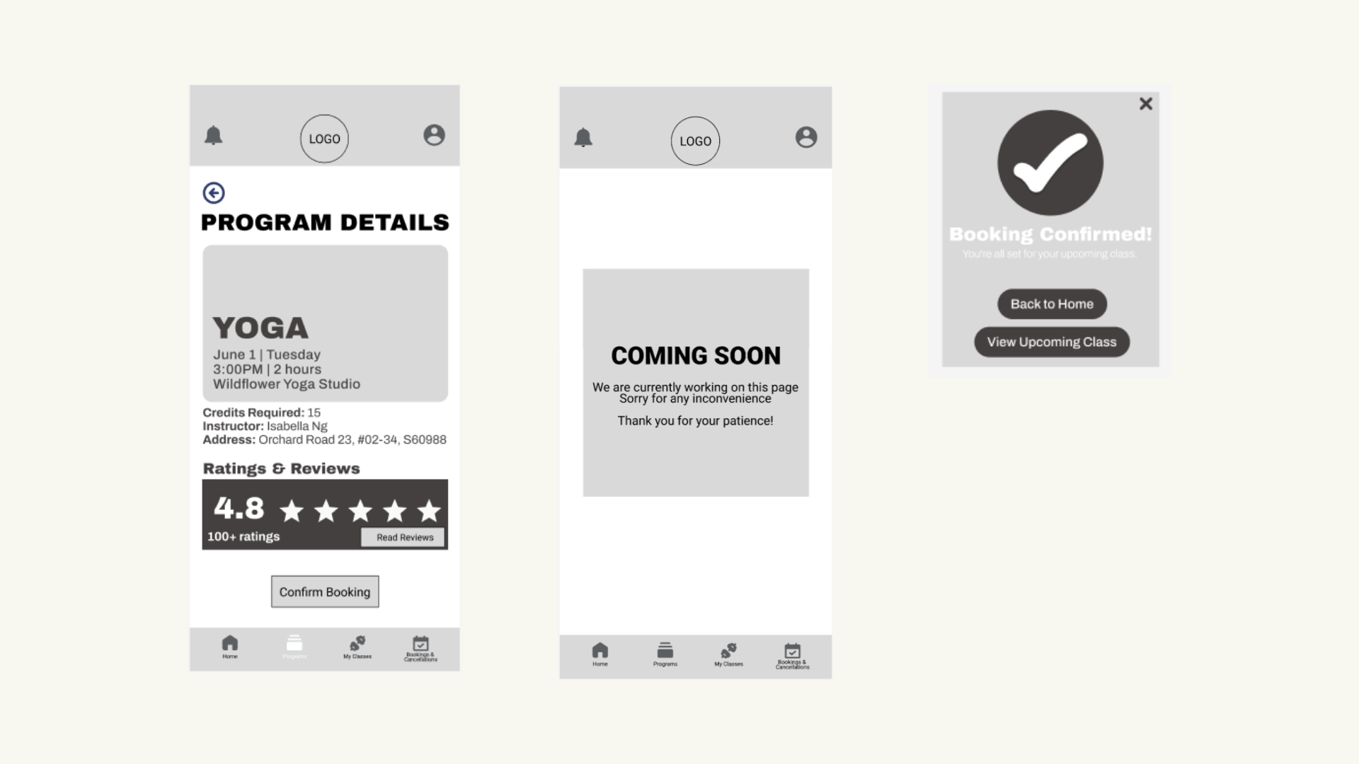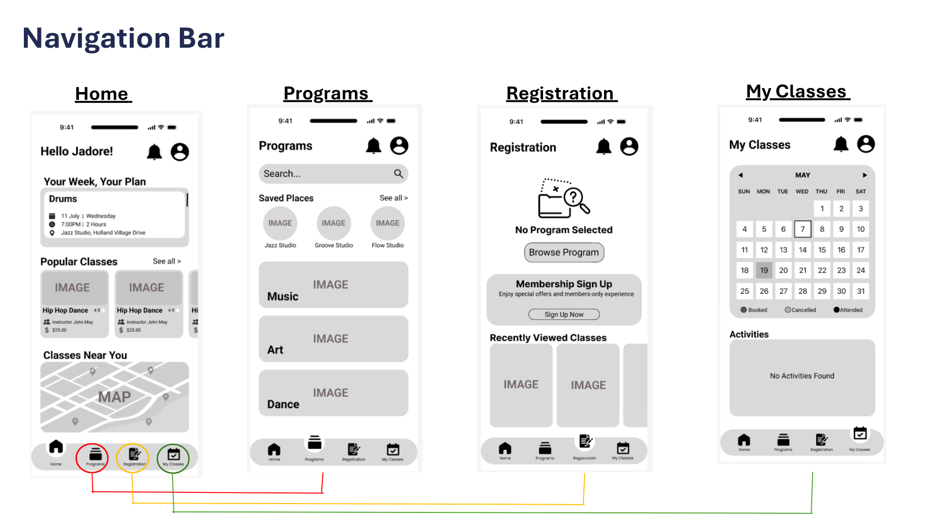 The app consists of 4 main pages: Home, Programs, Registration and My Classes, each created to streamline the user experience and make information and enrolment easy to access.