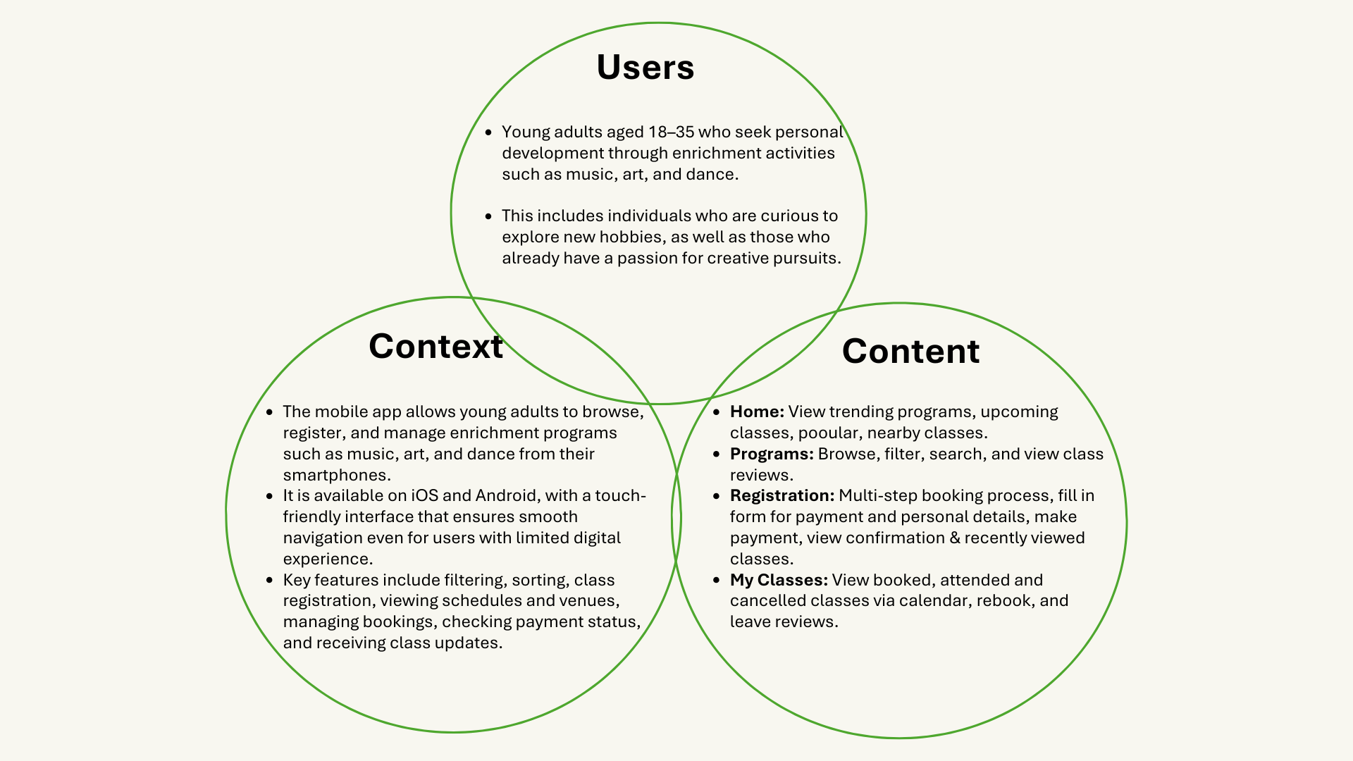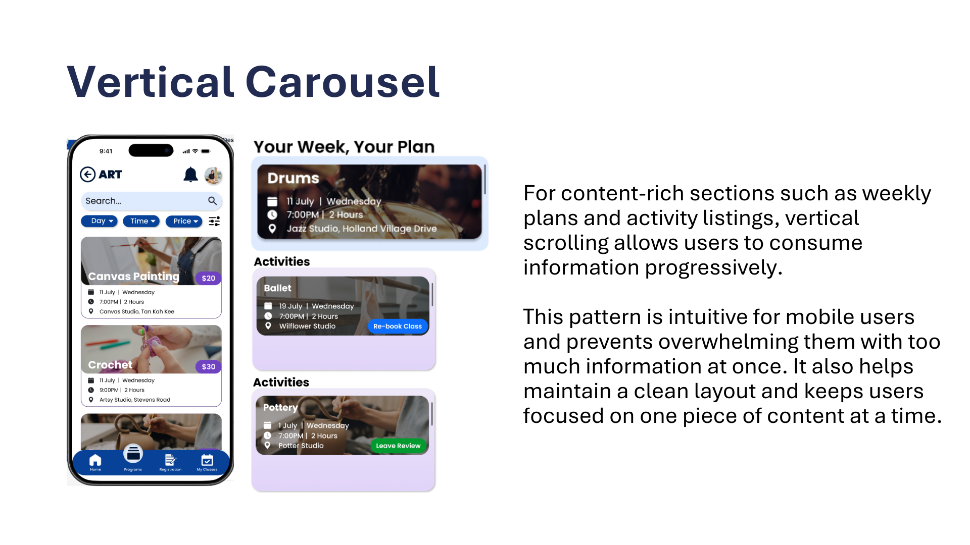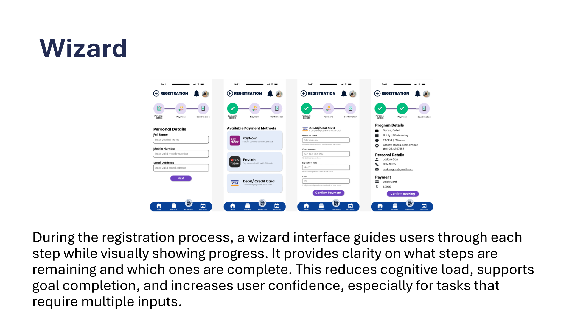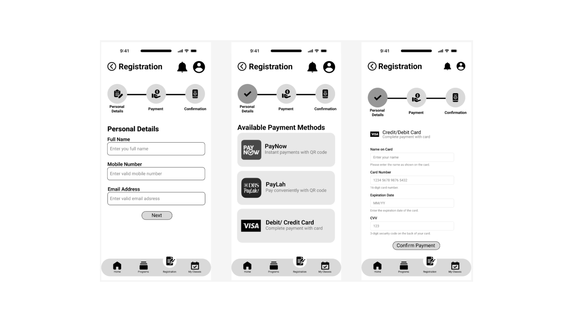 The app consists of 4 main pages: Home, Programs, Registration and My Classes, each created to streamline the user experience and make information and enrolment easy to access.