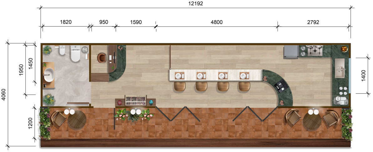 The service pod functions as the central hub of the space, featuring a reception counter where guests can conveniently check in and out of their accommodation pods. A small retail section is included, offering local merchandise such as helmets and apparel to add a sense of local connection. The pod also houses a café with both indoor and outdoor seating. Inside, white bar seats provide a casual dining option, while the outdoor seating area allows guests to enjoy their meals in a natural setting. The material palette further enhances the ambience, with lighter toned wood used for the flooring and dark green marble applied to the reception and café counters, creating a refined contrast that complements the nature inspired theme.
