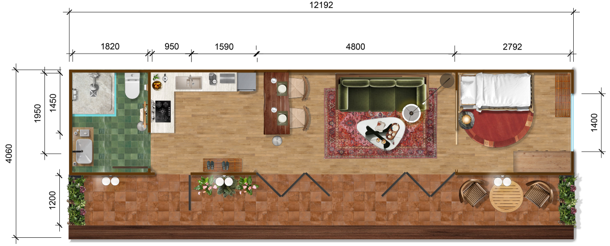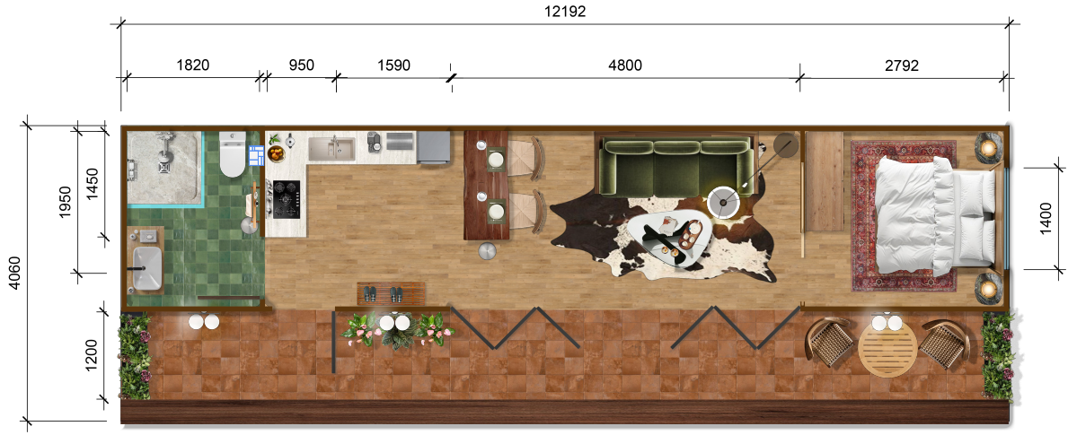 Accommodation Pod 2 is furnished with a bunk bed, making it ideal for friends or for those who prefer having their own personal space when sleeping. Reflecting the nature-inspired theme, the interior features varying tones of dark wood paired with green accents, creating a harmonious and complementary look. An outdoor seating area on the patio, surrounded by plants, further enhances the natural ambience.