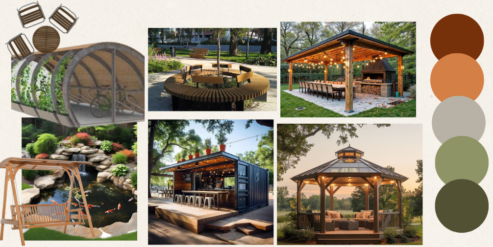 Sustainability is central to the design. Recycled wood is used for furnishings and structures, and energy-efficient lamp posts provide night-time ambience and visibility. Blending aesthetics, function, and placemaking, the space offers a meaningful retreat that promotes relaxation, connection, and appreciation of nature.