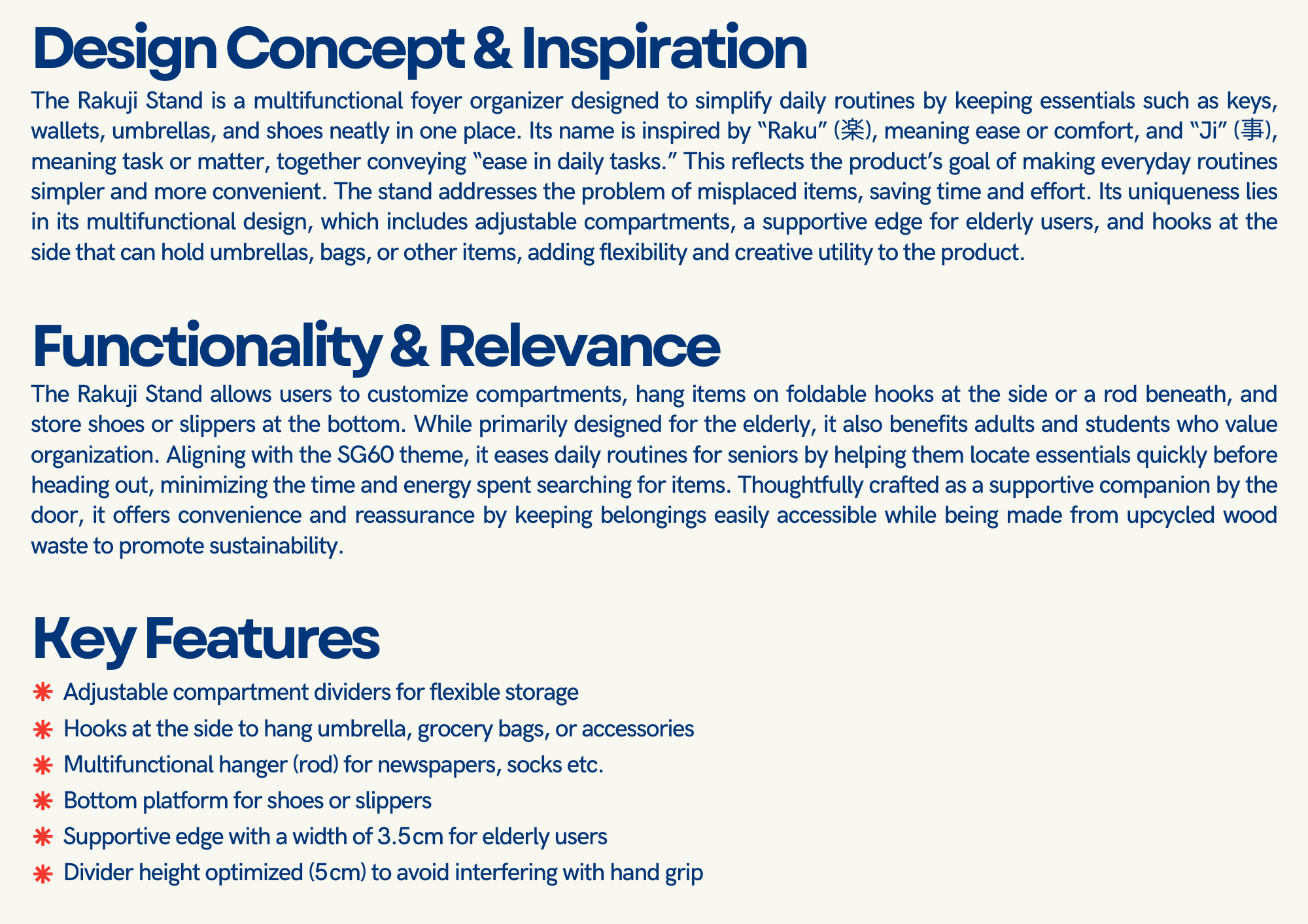 My team and I took part in the Singapore Timberwood Association School Design Competition, where we designed the Rakuji Stand, a multifunctional foyer organizer created to streamline daily routines by keeping essentials neatly in one place. We advanced to Stage Two, and the competition is still ongoing