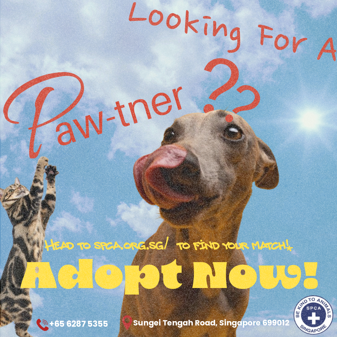 A bold ‘Adopt Now’ in yellow draws attention, while SPCA contact information is included so interested viewers can easily get in touch and make arrangements.