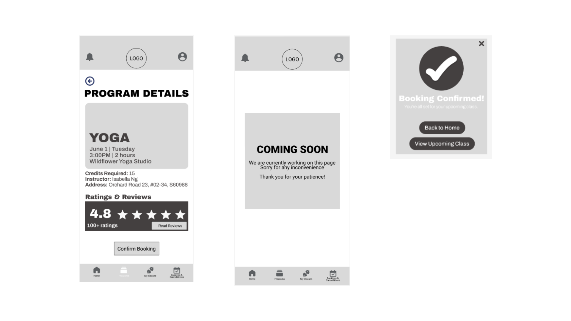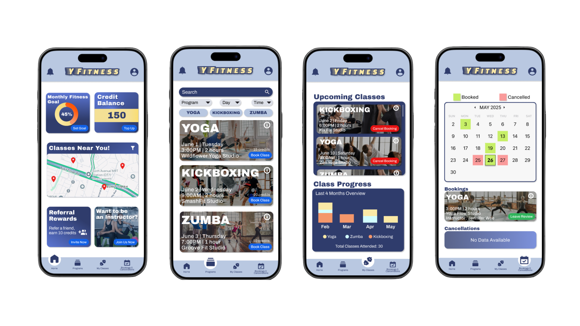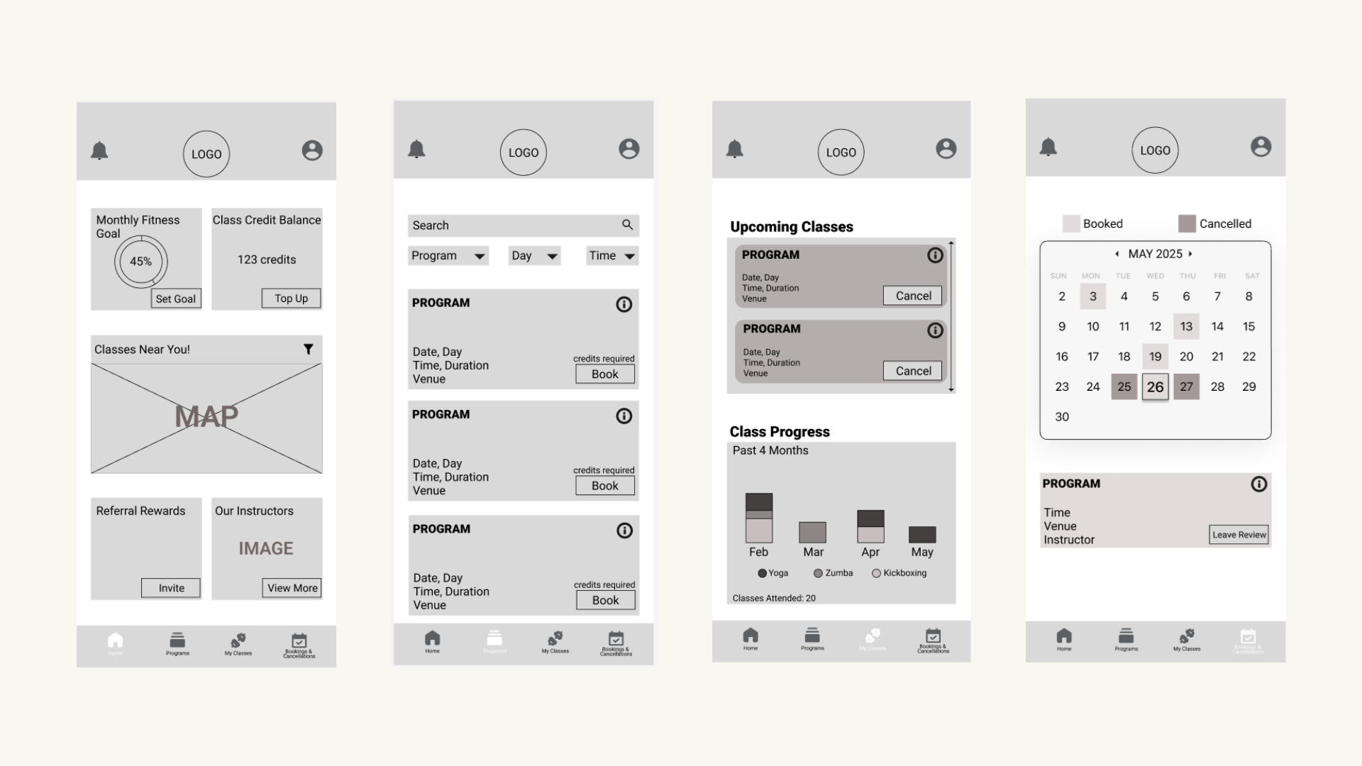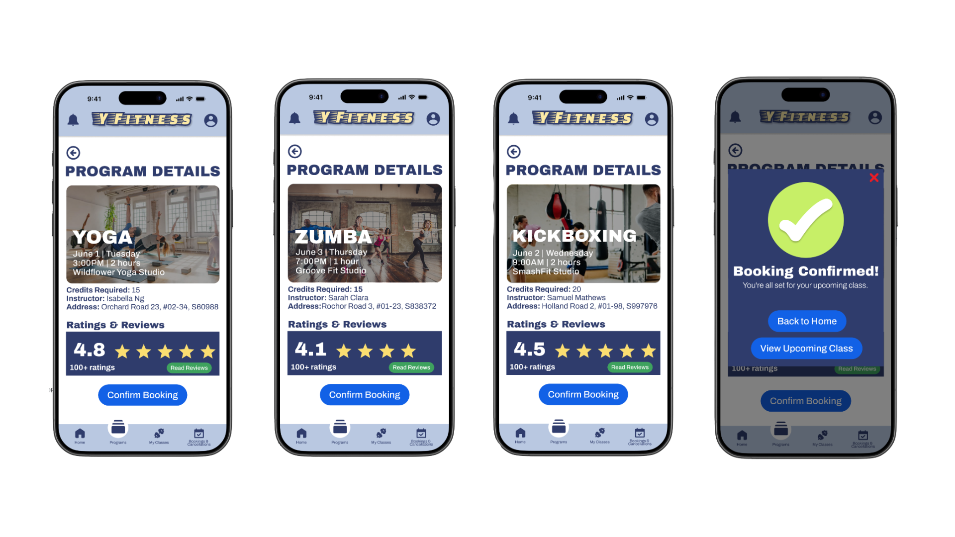 The app consists of 4 main pages: Home, Programs, My Classes and Booking & Cancellations, each created to streamline the user experience and make information and enrolment easy to access.