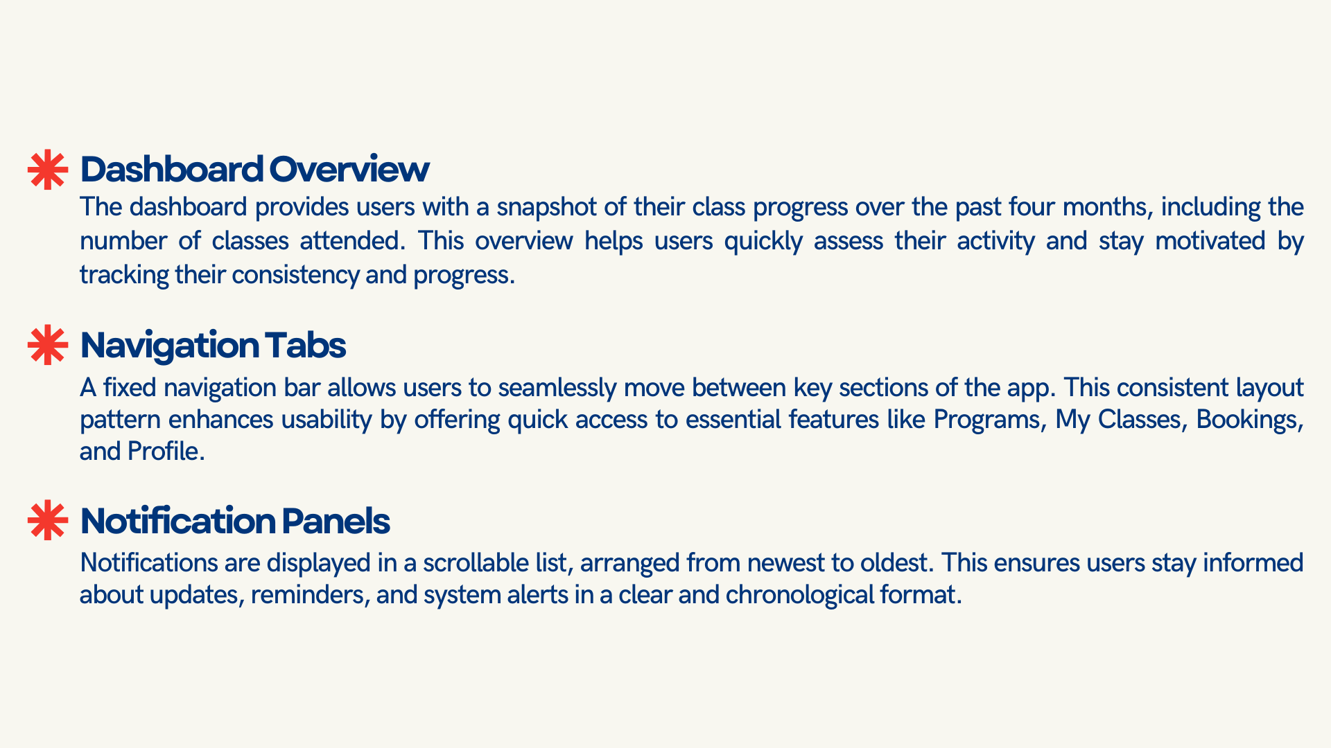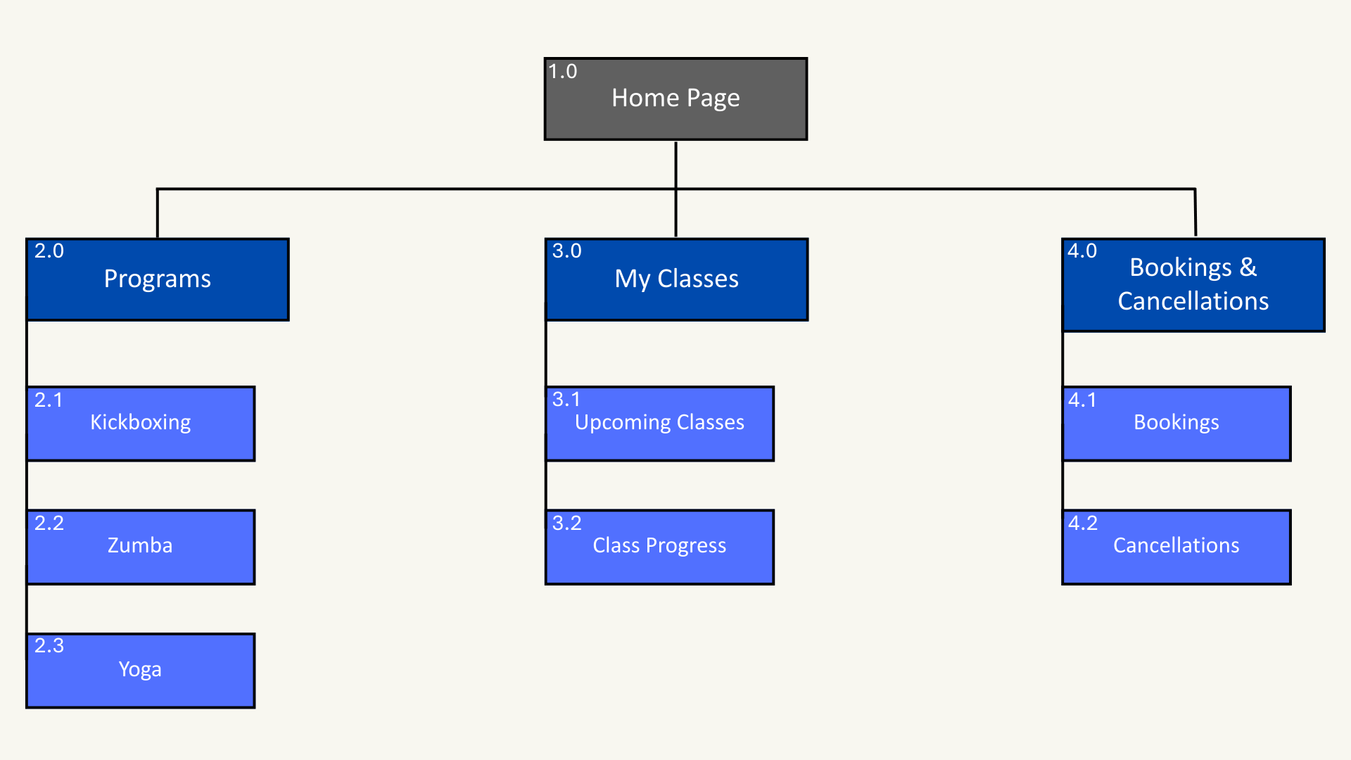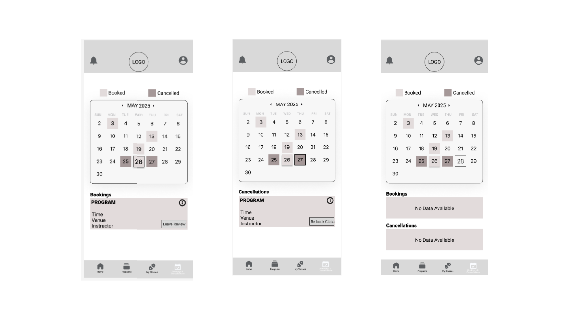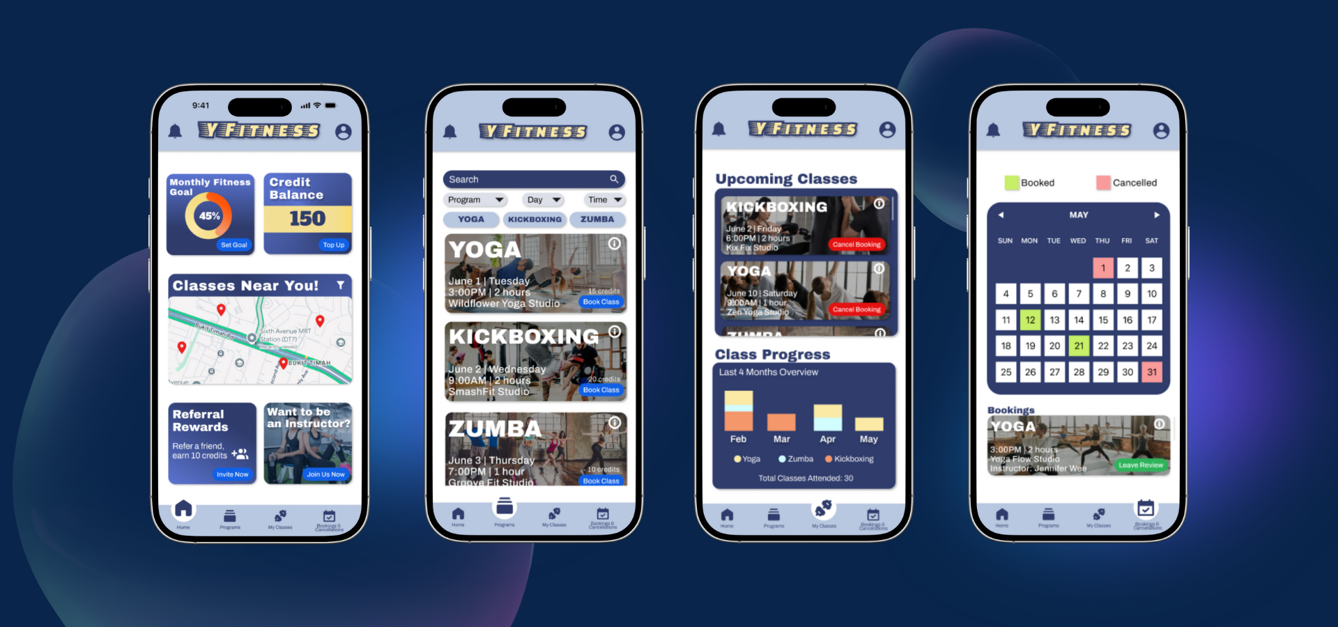 The app consists of 4 main pages: Home, Programs, My Classes and Booking & Cancellations, each created to streamline the user experience and make information and enrolment easy to access.